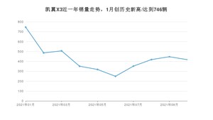 2021年10月,凯翼X3销量为417辆,同比下降12.03%,环比下降6.71%。1-10月份,凯翼X3销量为4290辆,同比增长1.32%。在最近1年中,凯翼X3销量在2021年01月达到最高,销量为746辆。