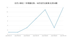 2021年10月,北汽小猫销量为12辆,同比增长71.43%,环比增长300%。1-10月份,北汽小猫销量为38辆,同比增长58.33%。在最近1年中,北汽小猫销量在2021年10月达到最高,销量为12辆。