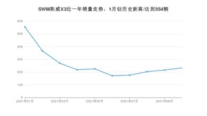 2021年10月,SWM斯威X3销量为233辆,同比下降35.46%,环比增长7.87%。1-10月份,SWM斯威X3销量为2631辆,同比下降9.99%。在最近1年中,SWM斯威X3销量在2021年01月达到最高,销量为554辆。