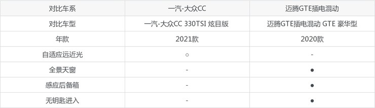至于配置,分别以一汽-大众CC和迈腾GTE插电混动的热销车型进行对比,迈腾GTE插电混动要比一汽-大众CC的配置更加丰富,多出了全景天窗、感应后备箱、无钥匙进入等配置。