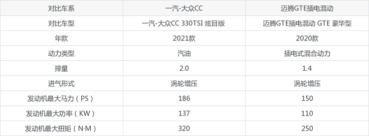 以热销车型进行对比,一汽-大众CC搭载了2.0T L4 186马力涡轮增压发动机,迈腾GTE插电混动采用了一套由1.4T L4 150马力涡轮增压的动力系统。
