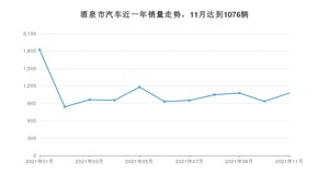 2021年11月,酒泉市汽车总销量为1076辆,同比下降13.02%,环比增长15.2%。1-11月份,酒泉市总销量为11768辆,同比增长16.32%。在最近1年中,酒泉市销量在2021年01月达到最高,销量为1820辆。