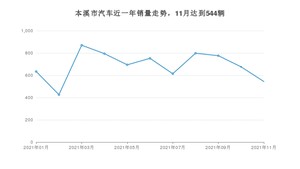 2021年11月,本溪市汽车总销量为544辆,同比下降21.95%,环比下降19.53%。1-11月份,本溪市总销量为7578辆,同比增长14.23%。在最近1年中,本溪市销量在2021年03月达到最高,销量为870辆。