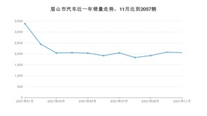 2021年11月,眉山市汽车总销量为2057辆,同比下降10.29%,环比下降0.96%。1-11月份,眉山市总销量为23804辆,同比增长9.5%。在最近1年中,眉山市销量在2021年01月达到最高,销量为3380辆。