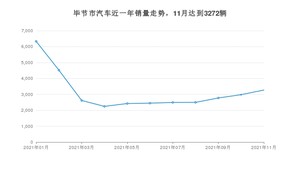 2021年11月,毕节市汽车总销量为3272辆,同比下降3.99%,环比增长9.76%。1-11月份,毕节市总销量为34605辆,同比增长8.71%。在最近1年中,毕节市销量在2021年01月达到最高,销量为6333辆。