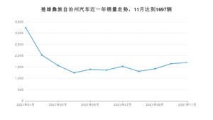 2021年11月,楚雄彝族自治州汽车总销量为1697辆,同比下降9.49%,环比增长2.97%。1-11月份,楚雄彝族自治州总销量为18447辆,同比增长6.85%。在最近1年中,楚雄彝族自治州销量在2021年01月达到最高,销量为3238辆。