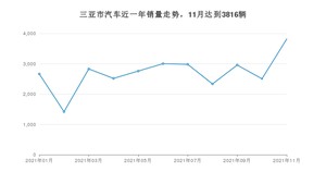 2021年11月,三亚市汽车总销量为3816辆,同比增长16.38%,环比增长52.4%。1-11月份,三亚市总销量为29787辆,同比增长48.01%。在最近1年中,三亚市销量在2021年11月达到最高,销量为3816辆。