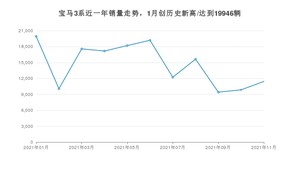 2021年11月,宝马3系销量为11444辆,同比下降25.36%,环比增长16.11%。1-11月份,宝马3系销量为160759辆,同比增长16%。在最近1年中,宝马3系销量在2021年01月达到最高,销量为19946辆。