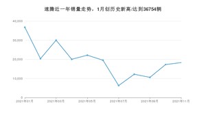 2021年11月,速腾销量为18299辆,同比下降44.61%,环比增长6.1%。1-11月份,速腾销量为213339辆,同比下降18.07%。在最近1年中,速腾销量在2021年01月达到最高,销量为36754辆。