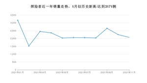 2021年11月,探险者销量为2074辆,同比下降33.08%,环比下降7.86%。1-11月份,探险者销量为24679辆,同比增长59.68%。在最近1年中,探险者销量在2021年01月达到最高,销量为3171辆。