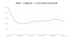2021年11月,博越销量为11617辆,同比下降28%,环比下降16.38%。1-11月份,博越销量为144746辆,同比下降4.96%。在最近1年中,博越销量在2021年01月达到最高,销量为23461辆。