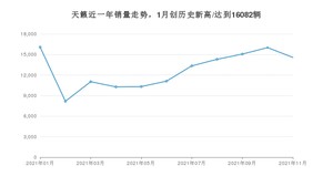 2021年11月,天籁销量为14580辆,同比增长24.84%,环比下降8.95%。1-11月份,天籁销量为140307辆,同比增长39.19%。在最近1年中,天籁销量在2021年01月达到最高,销量为16082辆。