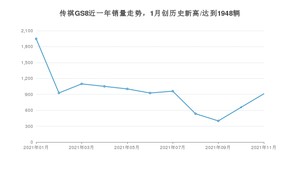 2021年11月,传祺GS8销量为911辆,同比下降47.1%,环比增长38.87%。1-11月份,传祺GS8销量为10415辆,同比下降35.37%。在最近1年中,传祺GS8销量在2021年01月达到最高,销量为1948辆。