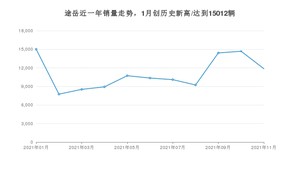 2021年11月,途岳销量为11862辆,同比下降7.44%,环比下降19.22%。1-11月份,途岳销量为121586辆,同比下降0.93%。在最近1年中,途岳销量在2021年01月达到最高,销量为15012辆。