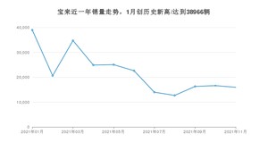 2021年11月,宝来销量为15954辆,同比下降56.67%,环比下降4.03%。1-11月份,宝来销量为242388辆,同比下降14.28%。在最近1年中,宝来销量在2021年01月达到最高,销量为38966辆。
