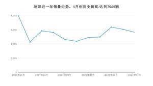 2021年11月,途昂销量为5648辆,同比下降22.93%,环比下降7.07%。1-11月份,途昂销量为60709辆,同比下降7.57%。在最近1年中,途昂销量在2021年01月达到最高,销量为7965辆。