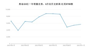 2021年11月,奥迪Q3销量为5655辆,同比增长10.73%,环比增长4.64%。1-11月份,奥迪Q3销量为73200辆,同比增长21.2%。在最近1年中,奥迪Q3销量在2021年06月达到最高,销量为8789辆。