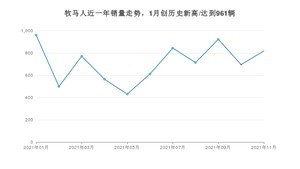 2021年11月,牧马人销量为818辆,同比增长28.21%,环比增长17.53%。1-11月份,牧马人销量为7834辆,同比增长8.68%。在最近1年中,牧马人销量在2021年01月达到最高,销量为961辆。