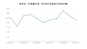 2021年11月,锐界销量为2256辆,同比下降16.97%,环比下降16.69%。1-11月份,锐界销量为27313辆,同比增长17.42%。在最近1年中,锐界销量在2021年09月达到最高,销量为3315辆。
