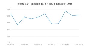2021年11月,揽胜极光销量为1245辆,同比增长8.17%,环比增长2.72%。1-11月份,揽胜极光销量为12362辆,同比增长19.47%。在最近1年中,揽胜极光销量在2021年09月达到最高,销量为1425辆。