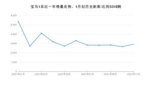 2021年11月,宝马1系销量为2927辆,同比下降18.81%,环比增长10.04%。1-11月份,宝马1系销量为35374辆,同比增长3.39%。在最近1年中,宝马1系销量在2021年01月达到最高,销量为5318辆。