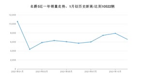 2021年11月,名爵5销量为6563辆,同比增长659.61%,环比下降17.07%。1-11月份,名爵5销量为66782辆,同比增长7%。在最近1年中,名爵5销量在2021年01月达到最高,销量为10522辆。