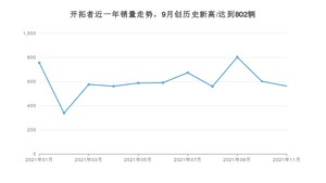 2021年11月,开拓者销量为562辆,同比下降29.22%,环比下降6.49%。1-11月份,开拓者销量为6604辆,同比增长52.55%。在最近1年中,开拓者销量在2021年09月达到最高,销量为802辆。
