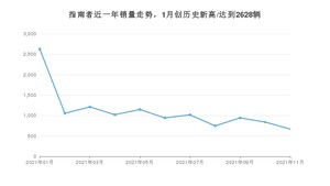 2021年11月,指南者销量为668辆,同比下降68.01%,环比下降20.48%。1-11月份,指南者销量为12222辆,同比下降35.31%。在最近1年中,指南者销量在2021年01月达到最高,销量为2628辆。