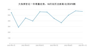 2021年11月,大指挥官销量为565辆,同比下降9.02%,环比下降1.74%。1-11月份,大指挥官销量为5243辆,同比下降8.24%。在最近1年中,大指挥官销量在2021年10月达到最高,销量为575辆。
