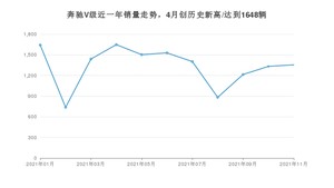 2021年11月,奔驰V级销量为1355辆,同比下降16.36%,环比增长1.73%。1-11月份,奔驰V级销量为14684辆,同比增长17.76%。在最近1年中,奔驰V级销量在2021年04月达到最高,销量为1648辆。