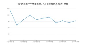 2021年11月,宝马8系销量为93辆,同比下降26.19%,环比增长10.71%。1-11月份,宝马8系销量为1094辆,同比增长21.15%。在最近1年中,宝马8系销量在2021年01月达到最高,销量为139辆。