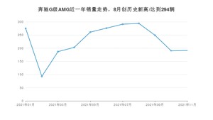 2021年11月,奔驰G级AMG销量为191辆,同比下降18.03%,环比增长0.53%。1-11月份,奔驰G级AMG销量为2510辆,同比增长17.9%。在最近1年中,奔驰G级AMG销量在2021年08月达到最高,销量为294辆。