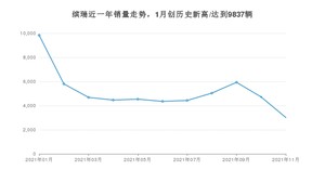 2021年11月,缤瑞销量为3014辆,同比下降54.53%,环比下降36.14%。1-11月份,缤瑞销量为56816辆,同比增长6.41%。在最近1年中,缤瑞销量在2021年01月达到最高,销量为9837辆。