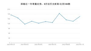 2021年11月,添越销量为166辆,同比下降22.79%,环比增长22.96%。1-11月份,添越销量为1595辆,同比增长22.88%。在最近1年中,添越销量在2021年08月达到最高,销量为184辆。