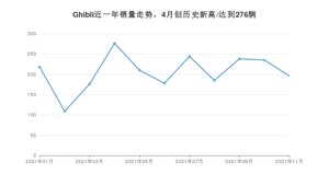 2021年11月,Ghibli销量为196辆,同比增长78.18%,环比下降16.6%。1-11月份,Ghibli销量为2265辆,同比增长70.69%。在最近1年中,Ghibli销量在2021年04月达到最高,销量为276辆。