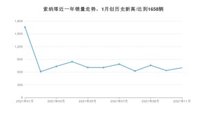 2021年11月,索纳塔销量为702辆,同比下降60.23%,环比增长10.2%。1-11月份,索纳塔销量为8770辆,同比下降24.19%。在最近1年中,索纳塔销量在2021年01月达到最高,销量为1658辆。