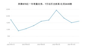 2021年11月,奔腾B70销量为1618辆,同比增长663.21%,环比增长7.65%。1-11月份,奔腾B70销量为15656辆,同比增长7%。在最近1年中,奔腾B70销量在2021年07月达到最高,销量为2435辆。