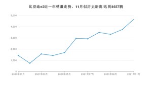 2021年11月,比亚迪e2销量为4657辆,同比增长123.36%,环比增长24.65%。1-11月份,比亚迪e2销量为27897辆,同比增长70.94%。在最近1年中,比亚迪e2销量在2021年11月达到最高,销量为4657辆。