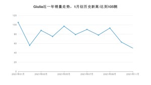 2021年11月,Giulia销量为50辆,同比下降41.86%,环比下降20.63%。1-11月份,Giulia销量为874辆,同比下降7.42%。在最近1年中,Giulia销量在2021年01月达到最高,销量为105辆。