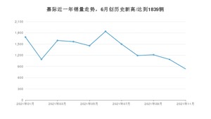 2021年11月,嘉际销量为834辆,同比下降64.08%,环比下降23.28%。1-11月份,嘉际销量为15055辆,同比下降42.42%。在最近1年中,嘉际销量在2021年06月达到最高,销量为1839辆。