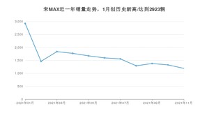 2021年11月,宋MAX销量为1191辆,同比下降47.37%,环比下降10.11%。1-11月份,宋MAX销量为17998辆,同比下降21.61%。在最近1年中,宋MAX销量在2021年01月达到最高,销量为2923辆。