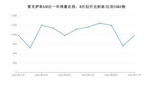 2021年11月,雷克萨斯UX销量为1176辆,同比下降10.02%,环比增长40.33%。1-11月份,雷克萨斯UX销量为13886辆,同比增长33.56%。在最近1年中,雷克萨斯UX销量在2021年08月达到最高,销量为1561辆。