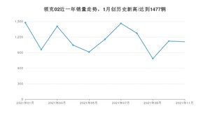 2021年11月,领克02销量为1109辆,同比下降26.85%,环比下降1.07%。1-11月份,领克02销量为12700辆,同比下降38.28%。在最近1年中,领克02销量在2021年01月达到最高,销量为1477辆。