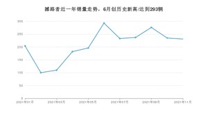 2021年11月,撼路者销量为231辆,同比下降24.76%,环比下降1.7%。1-11月份,撼路者销量为2297辆,同比增长26.84%。在最近1年中,撼路者销量在2021年06月达到最高,销量为293辆。