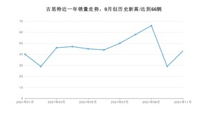 2021年11月,古思特销量为43辆,同比增长4%,环比增长48.28%。1-11月份,古思特销量为497辆,同比增长392.08%。在最近1年中,古思特销量在2021年09月达到最高,销量为66辆。
