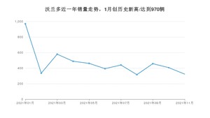2021年11月,沃兰多销量为323辆,同比下降63.71%,环比下降20.44%。1-11月份,沃兰多销量为5168辆,同比下降53.81%。在最近1年中,沃兰多销量在2021年01月达到最高,销量为970辆。