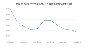 2021年11月,新宝骏RS-3销量为1699辆,同比下降61.6%,环比下降19.78%。1-11月份,新宝骏RS-3销量为33428辆,同比下降22.72%。在最近1年中,新宝骏RS-3销量在2021年01月达到最高,销量为5852辆。