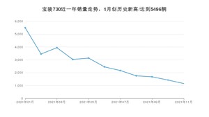 2021年11月,宝骏730销量为1155辆,同比下降71.47%,环比下降19.06%。1-11月份,宝骏730销量为29696辆,同比下降35.99%。在最近1年中,宝骏730销量在2021年01月达到最高,销量为5496辆。