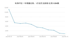 2021年11月,哈弗F7销量为706辆,同比下降92.39%,环比下降20.85%。1-11月份,哈弗F7销量为44788辆,同比下降48.18%。在最近1年中,哈弗F7销量在2021年01月达到最高,销量为11204辆。