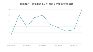 2021年11月,奥迪S7销量为30辆,环比增长150%。1-11月份,奥迪S7销量为180辆,同比增长17%。在最近1年中,奥迪S7销量在2021年11月达到最高,销量为30辆。